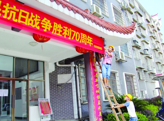9月1日,古丈县住建局,工作人员正在悬挂“隆重纪念中国人民抗日战争胜利70周年”宣传标语。当天,该县各大单位、学校、公共场所纷纷悬挂相关纪念标语,纪念中国人民抗日战争暨世界反法西斯战争胜利70周年。 张术杰 覃 勋 摄