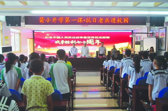 9月1日,为纪念中国人民抗日战争暨世界反法西斯战争胜利70周年,凤凰县共青团县委、沱江镇团委与箭道坪小学携手邀请抗战老兵饶明仲为箭小孩子们上一堂生动、鲜活的爱国主义教育课。 据了解,抗战老兵饶明仲于1925年出生,湖南长沙人。1944年7月在湖南衡阳入伍,参加中国国民革命军第十军,曾参加第二次长沙会战和衡阳会战,经历了世界反法西斯战役的重要一仗。抗