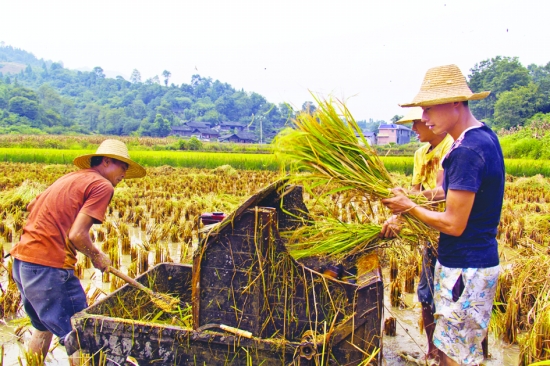 8月29日,古丈县红石林镇先锋村,村民正在田间收获稻谷。近日,水稻已陆续进入收获季,当地农民纷纷抢抓晴好天气收割稻谷。今年,该县大力推广超级稻、优质稻,多点示范粳稻,水稻种植面积达到8.1万亩,由于气候适宜、病虫害少,预计亩产达到了452公斤,全县总产量将达到3.6612万吨。 覃勋 张术杰 摄