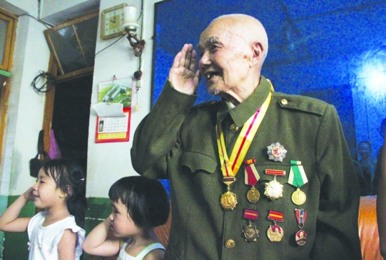▲9月3日,龙山县101岁的抗战老兵李开友在家观看中国人民抗日战争胜利70周年大阅兵,当天安门国旗升起的时候,这位老兵情不自禁的敬起军礼。李开友生于1914年12月,1934年5月参加中国工农红军,1936年1月加入中国共产党,先后经历了二万五千里长征、南泥湾大生产运动、抗日战争时期参加过百团大战等。在抗日战争胜利70周年之际,中共中央、国务院、中央军委为他颁发了中国