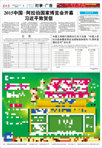 中国工商银行湘西分行关于兑换“中国人民抗日战争暨世界反法西斯战争胜利70周年普通纪念币”的公告