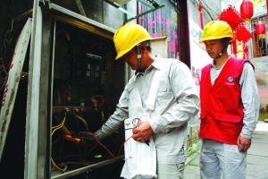 9月30日,国网凤凰供电公司电力特巡工作人员正在该县古城区对电力设施进行检查。