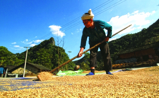 10月11日,花垣县吉卫镇夯来村,农民在忙着晒谷子。近日,天气晴好,结束了国庆长假以来的阴雨天气,当地农民抓紧开展秋收生产,确保颗粒归仓。 龙恩泽 摄