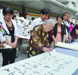 著名书法家林时九在民族文化进机关活动现场挥毫泼墨。