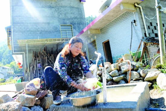 10月15日,永顺县青坪镇中湖村村民钱慧玉在家门口新建的水池旁洗菜。今年8月,该村在扶贫单位永顺县文化市场综合执法局的帮扶下,注入30万元资金,启动了该村的人畜安全饮水工程。经过两个多月的精心施工,日前该村170多户,700多人用上了干净、安全的自来水,结束了村民河中挑水的历史。 刘文化 摄