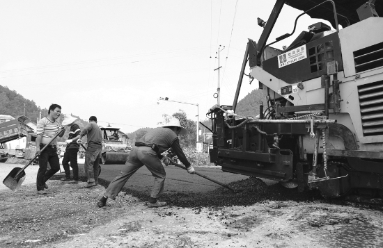 10月25日,花垣县团结镇至雅桥乡公路改造施工现场,建设者正在进行柏油路面摊铺作业。团雅公路改造工程全长19公里,总投资1.52亿元,目前已完成路基、水稳层、隧道、桥梁等工程,全线进入路面施工阶段。 龙艾青 摄