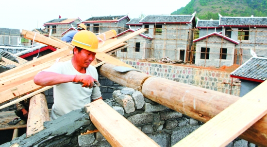 11月1日,花垣县龙潭镇精准扶贫异地搬迁安置房建设现场,施工人员正在忙着架横梁、钉椽条、盖新瓦。该项目投资2618万元,计划2016年2月竣工,并安置该镇李梅村地灾区135户群众集中居住。 龙艾青 摄