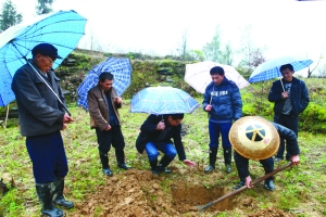11月24日,保靖县水田河镇林业站技术员梁绍明(左三),冒雨给该镇卡当村村民讲解挖穴种油茶技术。卡当村是团结报社的扶贫联系村,2014年,该村人均纯收入只有1980元,处于深度贫困状态。卡当村脱贫到底“卡”在哪里?“卡”在没有产业上。今年来,团结报社驻村扶贫工作组通过深入调查村情村史,察看地形地貌,上门上户走访,召开党员干部和群众大会,决定按照第一年办示范片,第二年全面铺开,第三年成规模的步骤,种植油茶2000亩以上,走开发油茶奔小康之路。 本报记者 龙清彰 摄