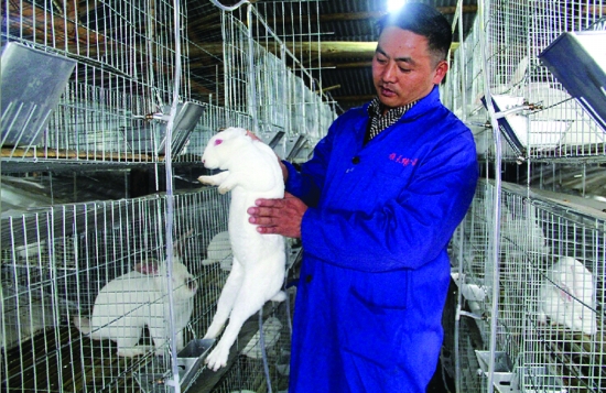 12月10日,花垣县两河乡路桥村,村民龙先林正在养殖场对兔子进行“体检”。2014年,龙先林从山东引进“皮肉兼用型”新西兰纯种獭兔进行养殖,效益可观,同时带动周边农户养殖獭兔,走上了脱贫致富的道路。 吴 柯 杨 木 摄