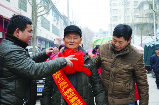 12月23日,永顺县“和顺现代农业合作社”技术员,在石堤镇为岩扎坪村田家组70岁村民田仕喜(中)胸前佩戴大红花,进行游行表彰。去年,田仕喜种了10亩名叫“天优华占”的水稻,挑战“天优华占高产冠军”大赛,创下了亩产干谷子1725斤的产量,成为湘西州唯一获此冠军的村民。为庆贺表彰,该合作社免费带田仕喜乘坐飞机到北京游览观光。