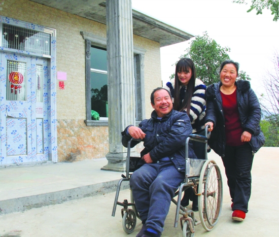 2015年12月31日,元旦节前夕,花垣县民乐镇新水村残疾老人向余强,在该县残疾人联合会工作人员的协助下,乘坐轮椅在房前院子里享受无障碍行走的快乐。他说:“能走出门外欣赏风景,是我几十年的梦想。”2015年年初以来,该县残疾人联合会落实资金,为重症肢体残疾人实施“无障碍实施改造”,硬化厅堂、院坝、通道等,使他们在元旦节前夕圆了“出门梦”。