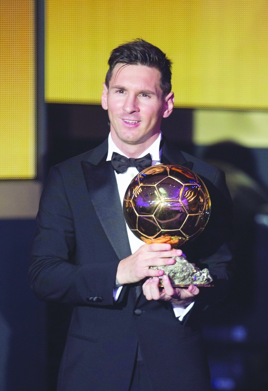 1月11日,国际足联2015年度金球奖颁奖典礼在瑞士苏黎世举行,阿根廷球员梅西获得年度最佳男子球员奖,成为足球史上首位五度加冕金球奖的球员。 图为2016年1月11日,梅西手捧金球奖奖杯。 新华社记者 徐金泉 摄