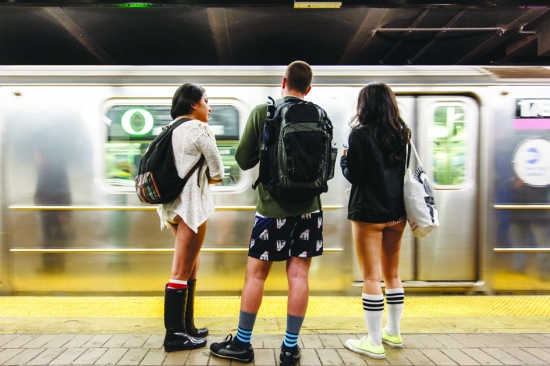 1月10日,在美国纽约,人们参加“不穿裤子搭地铁”活动。 “不穿裤子搭地铁”活动于2002年在美国纽约开始,当时只有7个人参加,但之后迅速发展。目前,这个源于纽约的行为艺术已经演变为世界多个城市的年度活动。 新华社记者 李木子 摄