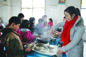 1月11日,保靖县清水坪学校教师在帮助留守娃打热乎乎的中餐。近年来,该县投入大量资金,新建学生澡堂,改造学生食堂,实施农村教育温暖工程,惠及3万多名农村留守娃。