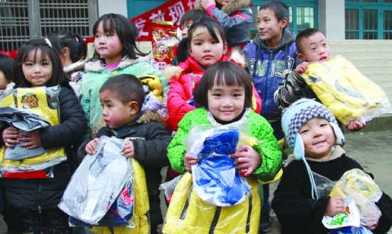 1月10日,花垣县启动“温暖过年”活动。当天,30多名边城爱心志愿者来到该县民乐镇路桥、麻家、盐井等村,为12户贫困学生家庭送去了粮油、面粉、猪肉、冬衣等过年物资。此活动,主要是帮助贫困学生家庭温暖过年而进行的。到月底将进行3个站点的年货发放。图为民乐镇盐井村的孩子们领到了新冬衣。 龙恩泽 摄