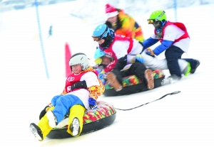 1月17日,在吉林万达长白山国际滑雪场,孩子们在体验冰雪娱乐项目。当日,以“体验、快乐、探索”为主题的“2016世界雪日暨国际儿童滑雪节”活动拉开帷幕。今年活动的主会场设在河北崇礼密苑云顶乐园滑雪场,同时还在北京、四川、浙江、黑龙江等地共20家滑雪场同步开展。