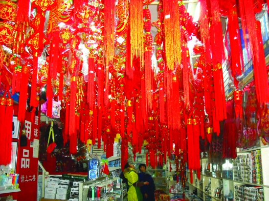 1月18日,永顺县府正街文化用品商场,员工正在悬挂春节喜庆饰品,以备百姓选购。随着农历猴年将至,一年一度的“文化年货”市场销售也早早地“热”了起来。充满喜气的红灯笼、中国结、对联、年画、窗花等各种迎春喜庆饰品在市场闪亮登场,成了百姓争相选购的“文化年货”。 吴 华 摄 “文化年货”迎新春