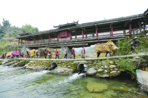 2月4日,广西龙胜平等镇广南村的侗族群众赶着“春牛”走村入户为民众祈福。