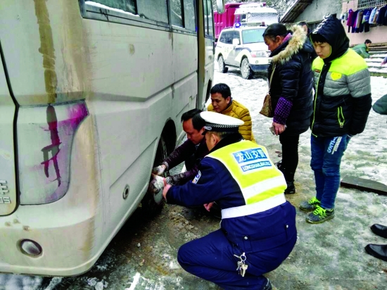 执勤民警在209国道龙山砂子坡冰雪路段,帮助客车驾驶人安装防滑链条。