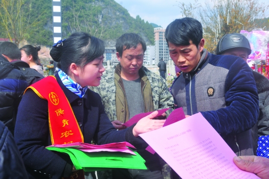 2月15日,保靖农村商业银行职员在开展阳光信贷宣传。当天,该行利用农民工返乡机会,开展了一次金融业务宣传活动。在本次活动中,累计发放宣传资料3000余份,接受咨询200余次。 特约记者 彭司进 通讯员 杨秀琼 摄