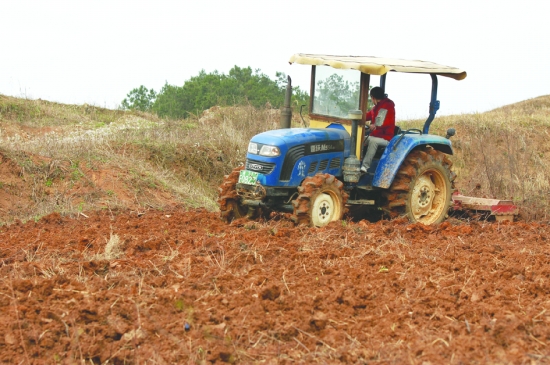 2月16日,花垣县石栏镇猫儿坡村,农机手正在田间耕作。近年来,该镇山塘、猫儿坡、岩科等村因地制宜开发种植近万亩红茶。近日天气晴好,紫霞村农机合作社的10多台农机前来助阵。 龙恩泽 摄
