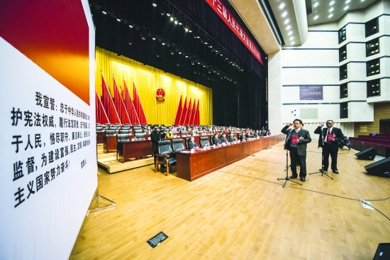 新当选的州十三届人大常委会副主任翟建凯与新当选的州十三届人大常委会委员吴东升、满荣付向宪法宣誓。 本报记者 陈 昊 摄