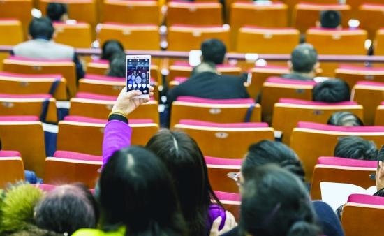 会议间隙,人大代表们也来一个自拍合影。 本报记者 陈 昊 摄