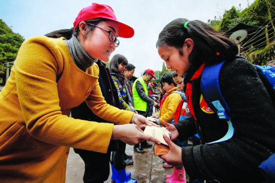 3月5日,由泸溪县委宣传部文明办和团县委组织的“春风送暖 精准关爱”学雷锋活动走进该县潭溪镇兴隆寨村小学,为留守儿童送去了学习用品和26500元助学金,爱心人士还与35位贫困学生结成了从小学到高中毕业一对一的帮扶对子。图为爱心人士给学生送去助学金。 张克宁 王 芳 摄