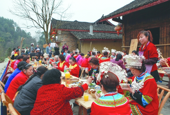 3月7日,游客在花垣县十八洞村吃长桌宴。近两年,该村着力发展乡村旅游,办起了7家农家乐餐馆,拓展了村民脱贫增收新渠道。 龙艾青 摄