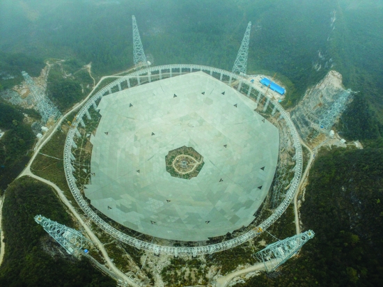 这是3月9日航拍的FAST全景。 截至3月8日,正在贵州省平塘县建设的世界最大单口径射电望远镜———500米口径球面射电望远镜(FAST),已完成3492块反射面面板安装,完成比例达78.47%。据悉,FAST的反射面总面积约25万平方米,用于汇聚无线电波、供馈源接收机接收,预计将于2016年4月安装完毕。 新华社记者 欧东衢 摄