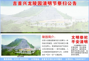 清明节是中华民族一个源远流长、内涵丰富的传统节日,凝结着恩记先祖、祭拜先人、崇尚孝道的民族精神。为引导市民树立文明节俭的祭拜新风,倡导环保健康、平安和谐的祭扫方式,兴龙陵园决定在清明节期间开展“文明祭拜平安清明”活动,现将活动内容公告如下: 一、活动时间:4月2日(星期六)至4月4日(星期日),每天上午8∶00至下午15∶00。 二、活动内容: 1、清明节前兴龙陵园进行公祭,给安葬于陵园的每位逝者敬献鲜花。 2、免费接送祭拜祭扫市民:活动期间,安排车辆在乾州农贸市场(即兴龙陵园入口处),免费往返接送扫墓市民上下山。 3、为前来兴龙陵园祭扫的市民免费提供茶水。 4、为客户提供殡葬政策法规解答,现场受理客户投诉意见。 5、在墓区安排巡视人员,引导市民进行安全、文明祭扫活动,并随时在墓区消除火灾等安全隐患。 6、清明节期间(3月25日-4月10日),凡购高档及以上墓型可享受5%的价格优惠。 建议广大市民尽量避开4月4号扫墓高峰期,提前或推迟扫墓出行时间,以免因交通堵塞给大家出行带来不便;并倡导采取赠送鲜花、网上和墓前追思等文明祭扫方式,严禁燃放冲天礼炮,减少燃放爆竹、焚香烧纸引发火灾和环境污染;同时,上山道路弯多路窄,自驾车辆人员要注意交通安全,减速慢行,并请按陵园指定要求停放车辆。 特此公告。 吉首兴龙陵园 2016年3月30日 |