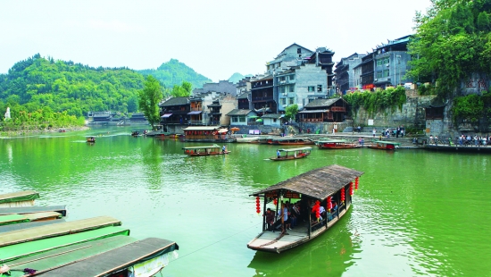 5月1日,游客在花垣县边城景区休闲游玩。当天边城茶峒天气晴好,古码头、书法园、翠翠岛等景点迎来众多游人参观,感受“一脚踏三省”的独特风光。 本报特约记者 龙艾青 摄