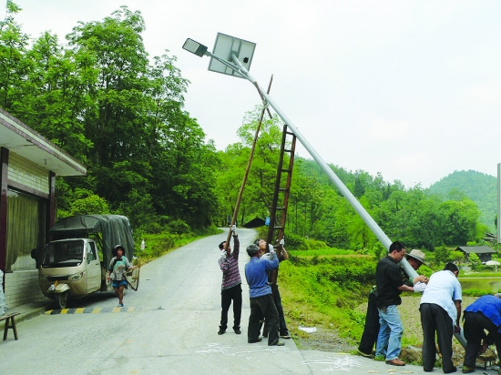 5月5日,州团结报社3名工作人员与保靖县水田河镇五牙村的村干部及村民一道为该村安装太阳能路灯。五牙村是州团结报社的扶贫村,自报社扶贫工作组驻村以来,多方努力为该村办实事。该批路灯是经工作组联系,由浙江宁波的赵嘉波先生、深圳的王涛先生爱心捐赠的。 本报记者 左 俊 摄