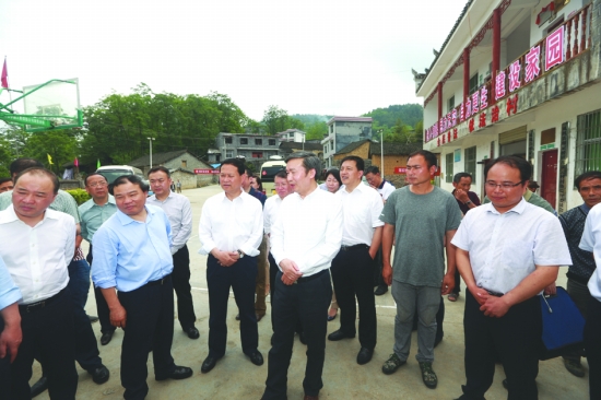 交通运输部副部长何建中(中)一行来到凤凰县廖家桥镇古双云村,查看了通村公路拓宽改造情况。 本报记者 彭 伟 摄