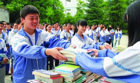 6月4日,高考即将来临之际,花垣县边城高级中学组织高中毕业生为学弟学妹捐赠工具书、复习题库、辅导资料、读书笔记和错题集等学习资料共计5000余本,以此帮助考生减压,为他们参加高考加油鼓劲。 周智敏 摄