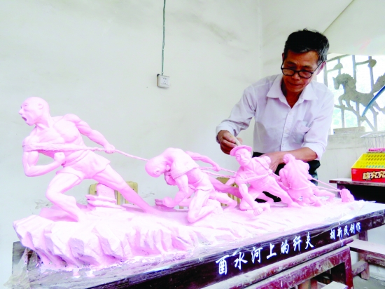 6月11日,保靖县迁陵镇65岁的胡新民在家雕塑“酉水河上的纤夫”。胡新民自幼就酷爱雕刻塑像艺术。经过几十年的不懈努力,塑造了各种栩栩如生、惟妙惟肖的人物肖像。近年来他创作的作品先后远销台湾、海南等地。 彭 达 摄