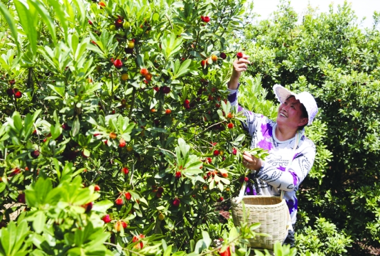 6月14日,龙山县兴隆街道望城社区村民杨爱花喜摘杨梅。她家9年前种植的500株荸荠种杨梅树进入盛果期,丰收在望。由于采用有机种植,目前虽然果实还挂在树上,却已被湘鄂边区客商来人或电话预定4000公斤。 田良东 摄