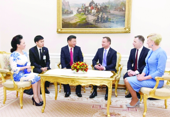 6月20日,国家主席习近平出席波兰总统杜达在华沙总统府举行的隆重欢迎仪式。欢迎仪式后,习近平和夫人彭丽媛同杜达和夫人阿加塔简短寒暄。 新华社记者 饶爱民 摄