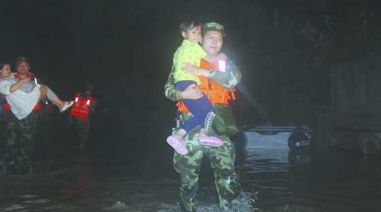 6月20日下午,武警湘西州支队紧急出动100名官兵驰援里耶,第一时间进入救灾现场参加抗洪救灾。截至当日20时,武警官兵共紧急疏散转移群众2000余人,抢救物资500余万元。图为武警官兵在连夜转移受灾群众。 王桥强 摄
