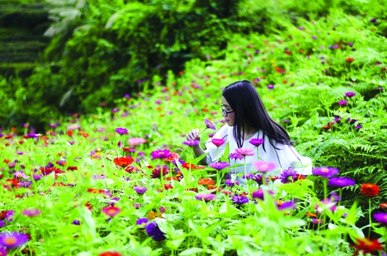 7月9日,古丈县古阳镇尾矿库隐患整治区,一游客正在观赏花卉。尾矿库隐患整治治理项目是该县治理重金属污染的重点项目之一,总投资700万元。通过近两年的大力整治,曾经满目疮痍令人避之不及的尾矿库如今鸟语花香,成了该县人们休闲娱乐的新花园。 宋勇云 谭意芬 摄