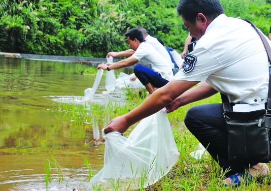 日前,泸溪县渔政管理部门的工作人员在达岚镇潮地村人工放流鱼苗。为改善溪流水质、修复溪流生态平衡,6月上旬以来,该县畜牧水产局先后在石榴坪、兴隆场、潭溪等7个乡镇的主要溪流人工增殖放流草鱼、雄鱼、鳊鱼、鲢鱼等鱼种共320多万尾,用以改善溪流生态环境及水生物的多样性。 吴代清 摄