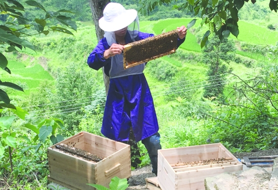 近年来,保靖县咱科村采取“党建+合作社+互联网+农户”模式,注重党员带头、技能培训、合作社包装销售、微信群信息传播,因地制宜发展养蜂业、烟叶等产业。截至目前,该村养蜂580多桶,发展烟叶500余亩,吸纳了20余名青壮年返乡创业。 图为7月20日,该村返乡大学生刘银在给自己养的蜜蜂更换蜂桶,预防绵虫。 田枫 彭淞颐 摄
