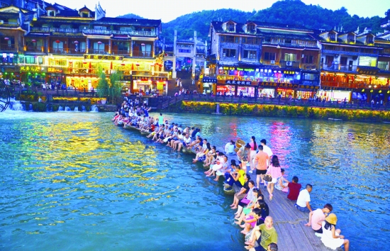 7月26日,游客和市民在凤凰古城沱江边上享受清凉。炎炎夏日,凤凰古城景色宜人,气候凉爽,全国各地游客纷纷慕名而来,亲近自然,感受清凉。 刘 伟 摄