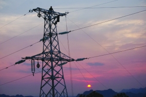 7月27日黄昏,永顺县大青山风电场110千伏新架线路,电力工人正冒着高温热浪,在途经灵溪镇树木村的电力铁塔上架设电线,确保我州首个风电场在今年下半年并网发电。