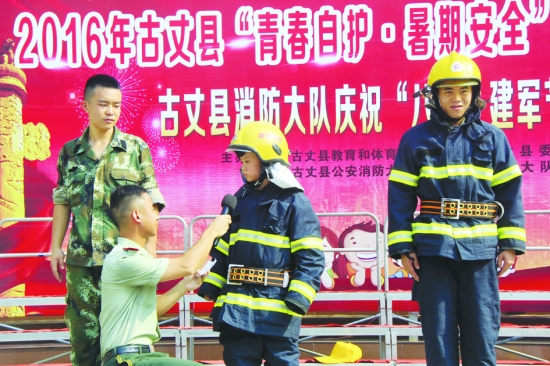 8月1日,古丈县青少年活动中心合唱团的成员与县消防大队的官兵举行了别开生面的庆“八一”建军节活动。合唱团的青少年为部队官兵献上了精彩的歌唱节目,县消防大队的官兵为青少年们讲解传授自我保护灭火、防火知识,增强了青少年热爱生命自我防护的意识。 本报特约记者 石立新 通讯员 宋 盼 彭昭君 摄