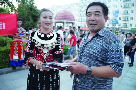 7月28日至8月2日,永顺县土家族民族艺术团的文化志愿者利用“春雨工程”边疆行演出的空余时间在吉林省延边市、黑龙江省虎林市等地向市民宣传湖南省首个世界文化遗产地老司城,发放宣传资料3000余份,扩大老司城对外影响力,助推文化旅游。图为演职人员正在向黑龙江省虎林市市民介绍老司城。 刘文化 向飞卿 摄