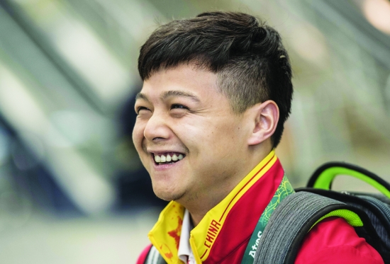 8月3日,中国举重队选手龙清泉抵达里约国际机场。 当日,前来参加里约奥运会的中国国家举重队抵达巴西里约热内卢。 新华社记者 吕小炜 摄