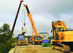 8月10日,石洗公路(S260龙山县石牌镇至洗洛镇公路)建设工地上,工人们正在安装三塘中桥空心板。石洗公路全长33.021公里,全线采用二级公路标准建设,路基宽8.5米,项目预算总投资2.78亿元,计划2017年基本建成通车。 田春阳 付 军 摄