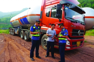 今年以来,泸溪县交通运输管理所开展交通大整治,出动检查组29个,人员179人次,检查相关经营单位67家,排查各类安全隐患31处,处置21处。图为8月10日,该县交通执法人员在319国道严查驾驶员证照、超载、危化品安全运输现场。