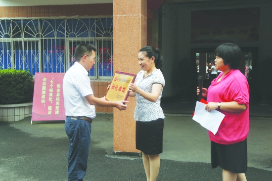 花垣县委常委、县委宣传部部长龙仕英(中)为财政局党委授牌。